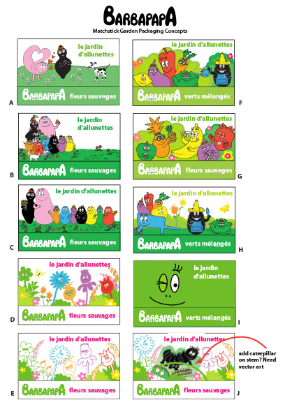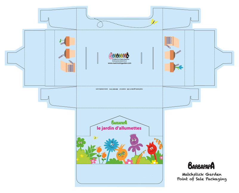 I created these Barbapapa designs under the license for Notedco giftware company. Matchstick gardens were a popular item in their catalog. I provided several concepts for the individual matchstick covers and designed the packaging to house them.