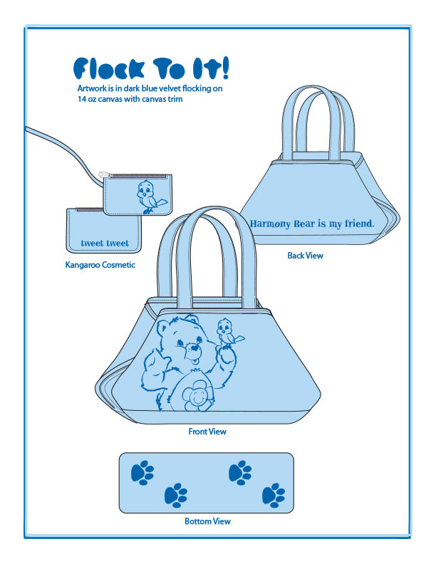 This was part of a series of licensed development that used flock printing on canvas. Shown here in purple and blue colorways withe different CareBears character.