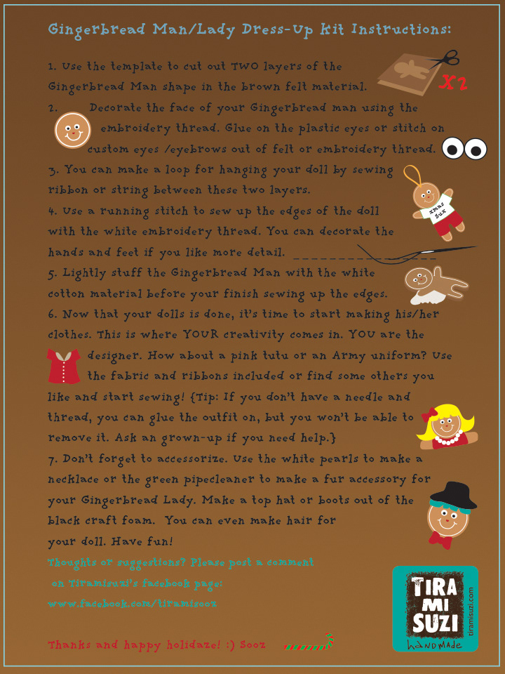 I created this DIY craft kit to sell at art markets in Singapore. It has all of the components and instructions including optional accessory ideas that the user can choose to decorate their gingerbread person with.