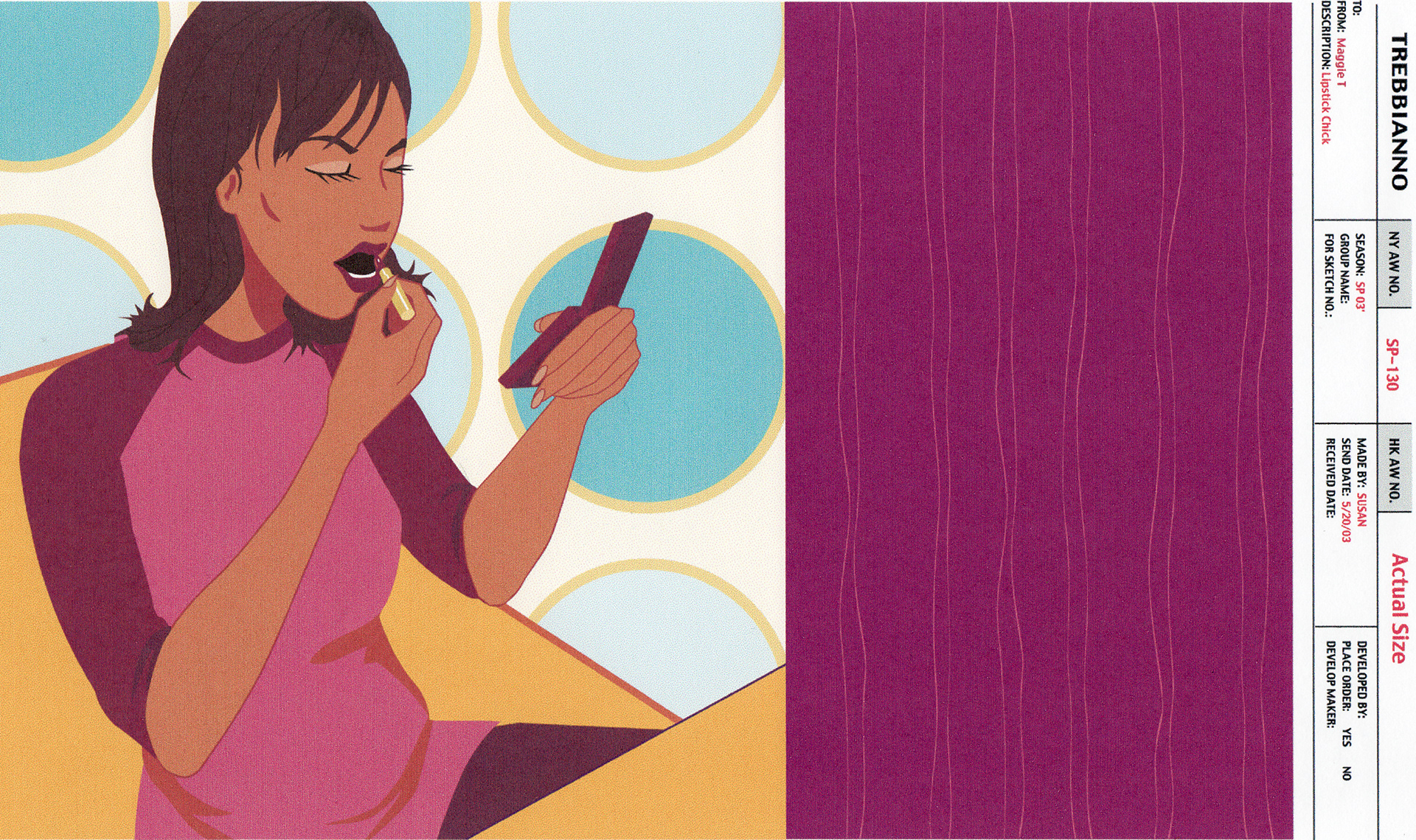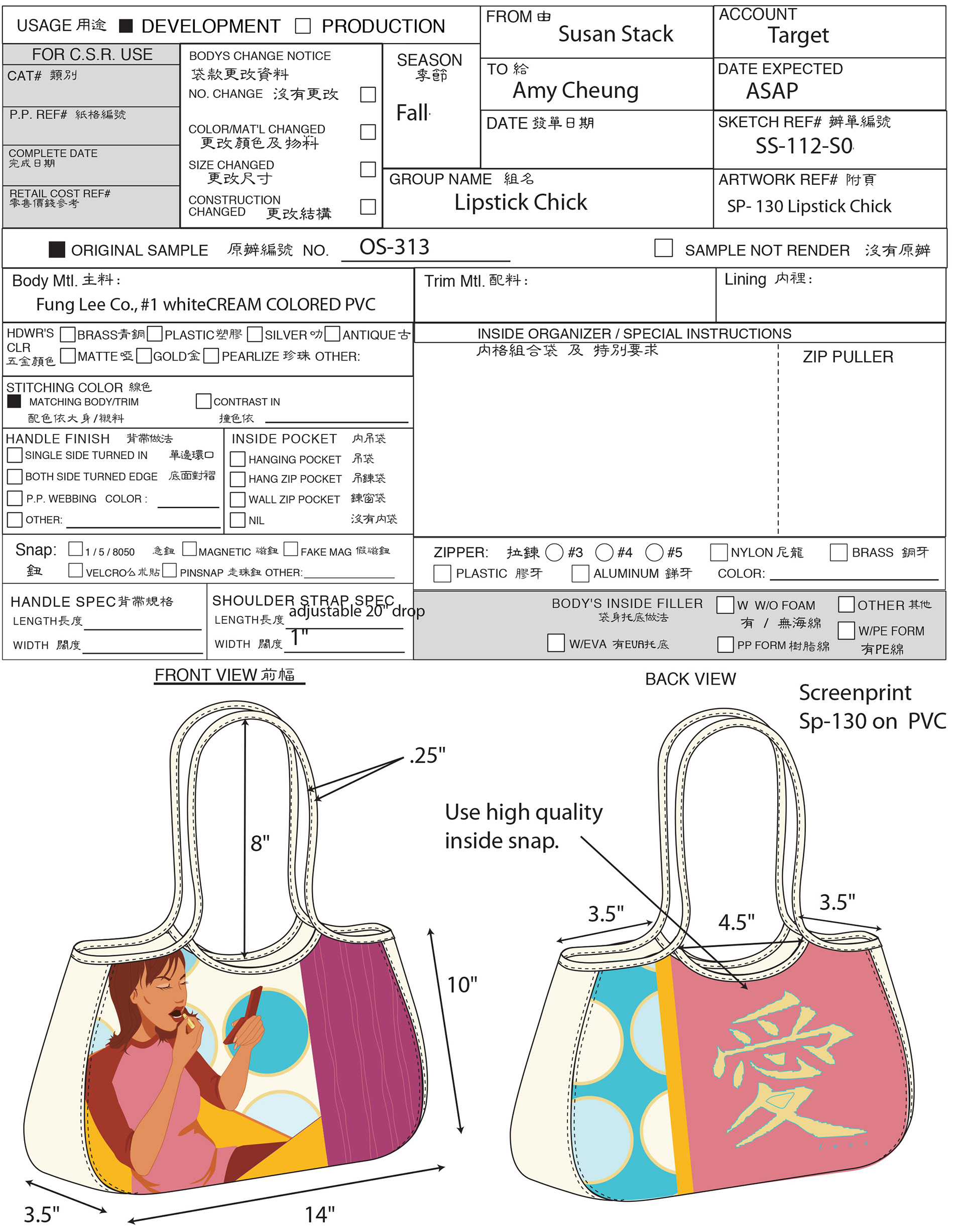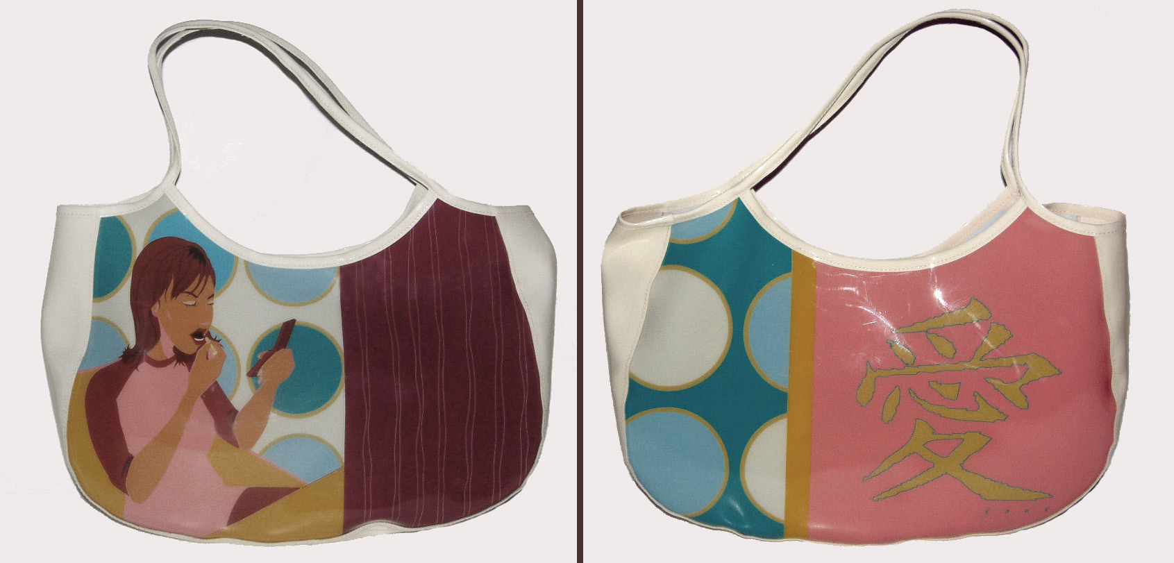 This vinyl bag was created for the generic juniors market. The fashion illustration was purchased, rights managed. I altered it slightly and created the background graphic.