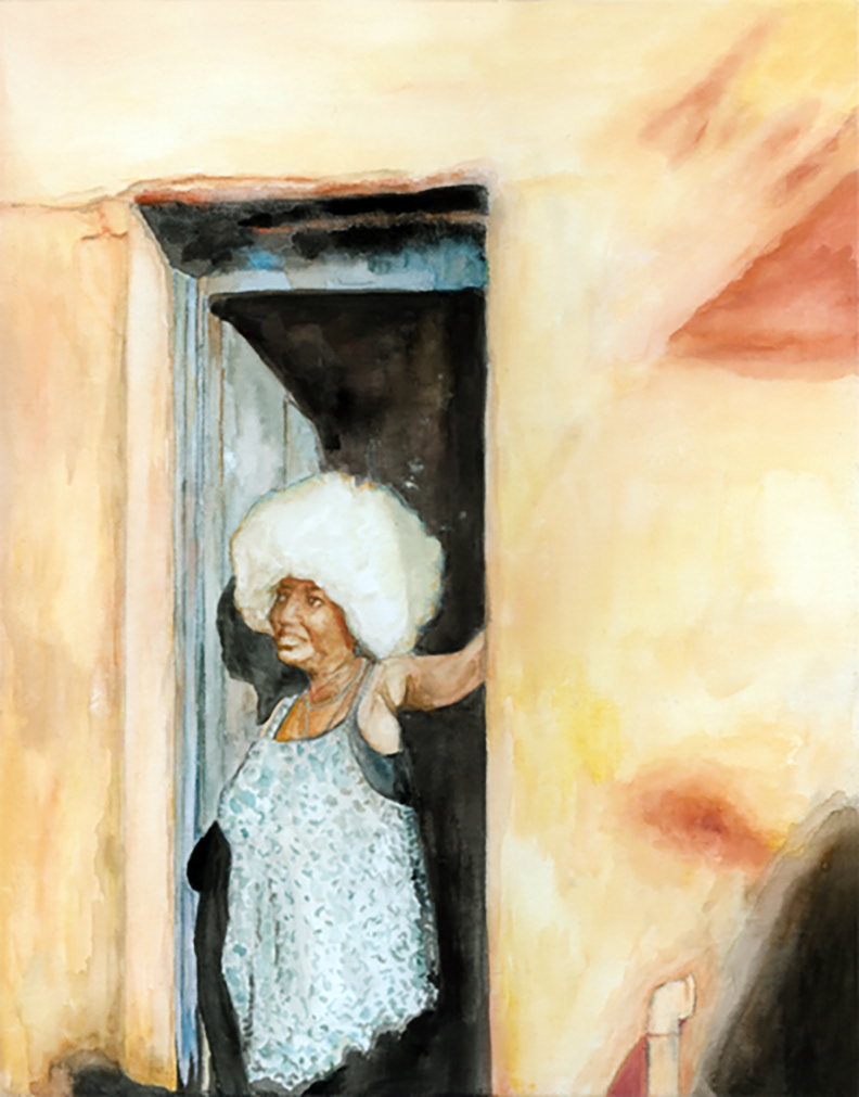 This watercolor painting was based on a photo that I took around Halloween, 1997 in New Orleans, Louisiana. I was enamored by this anonymous strong woman in the doorway of a hot building in the strong October sun. It was really her big, beautiful afro that made me smile. I painted this as a meditative contemplation in August 2005 when Hurricane Katrina rolled in. I wonder if this woman survived the storm. Where is she now?